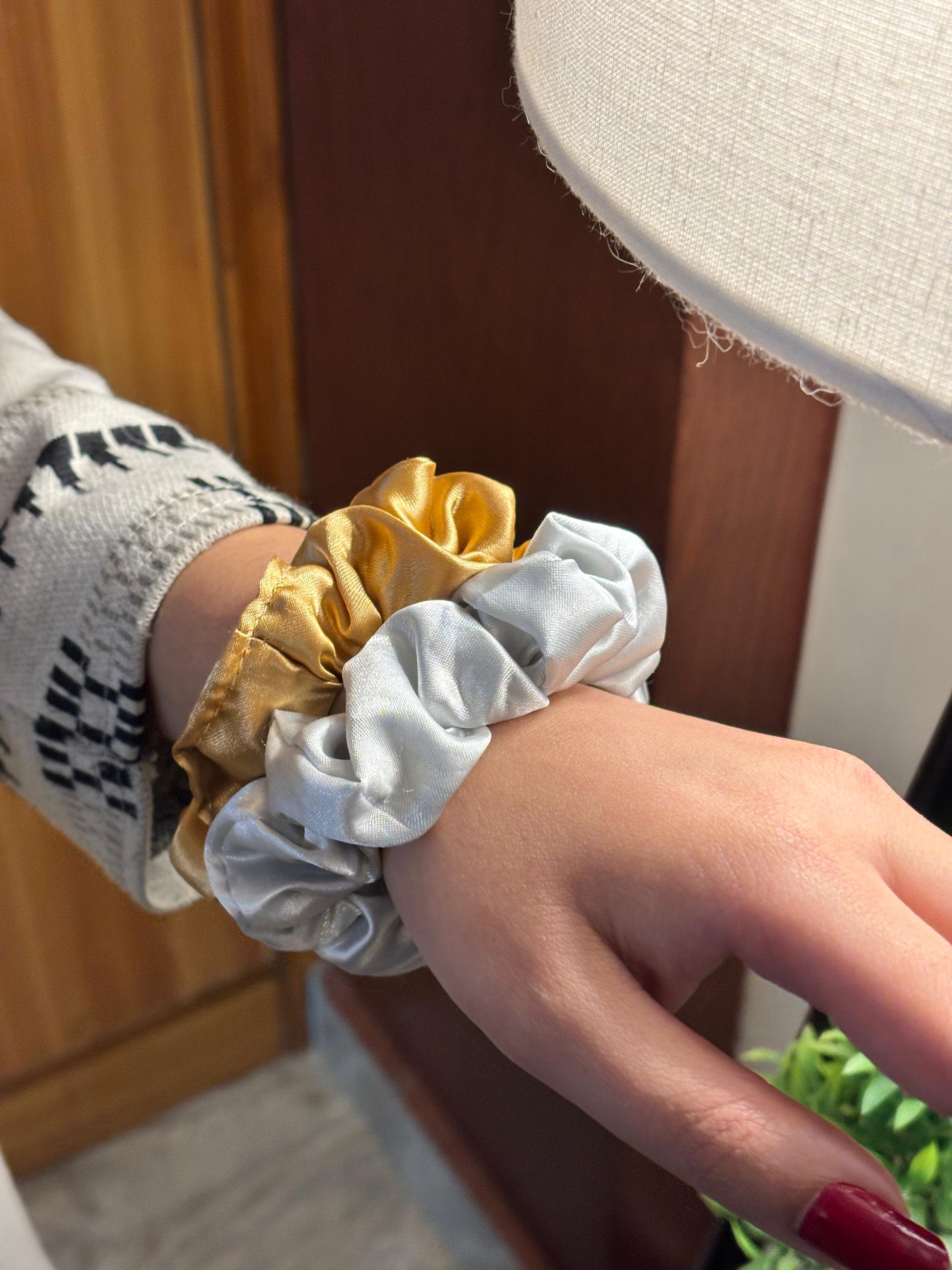 - Gold satin scrunchie β Elegant satin scrunchie in a rich gold tone.