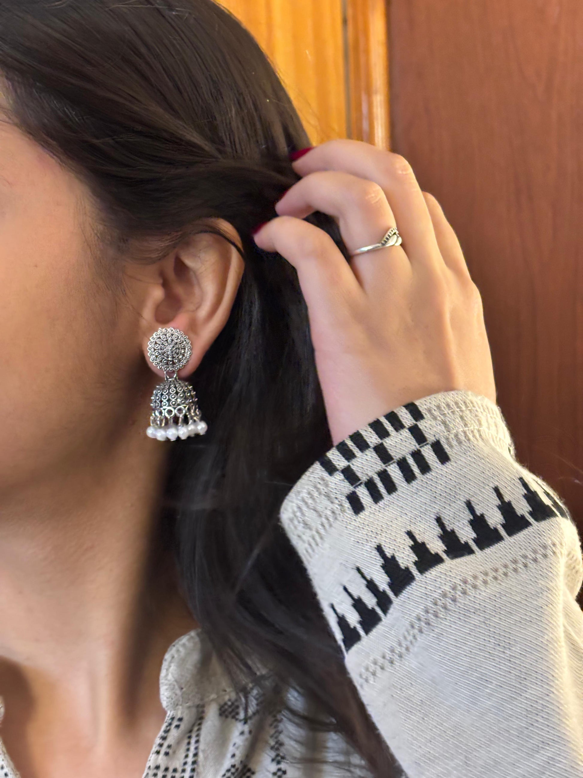 - Oxidised square jhumka earrings β Square oxidised stud with layered dangling bead elements.